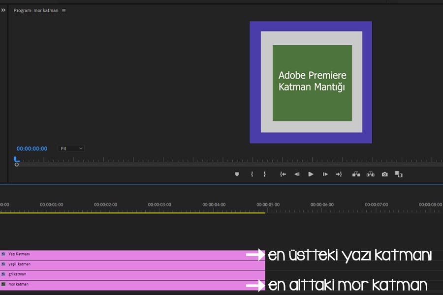 Adobe Premiere programında Photoshop programındaki gibi katman (layer) yapısı mantığı bulunmaktadır. Yani en altta bulunmasını istediğiniz video veya arkaplanı en altta bulundurmalısınız. Bu mantıkla düşünüldüğünde yazı, logo vs eklendiğinde en üstte görünmesini istediğiniz katmanı en üstte bulundurmanız gerekir. Aşağıdaki görselde katman mantığını görebilirsiniz.