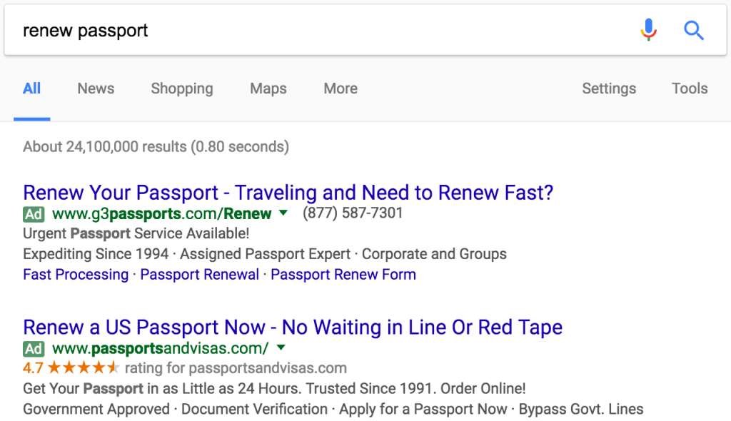 Yaklaşan bir yurtdışı tatiliniz var ve hızlı bir şekilde pasaport yenilemesi gerekiyor. “Renew passport” olarak arama yapıyorsunuz. Ve karşınıza iki reklam çıkıyor.